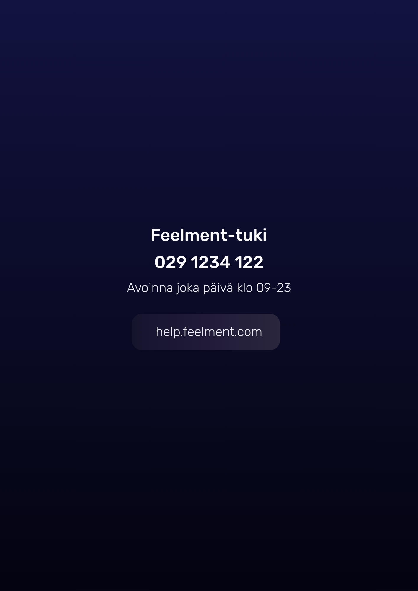 Lataa Feelmentin tukitaustakuva tietokoneelle/tabletille. Taustakuvasta löytyy Feelmentin teknisen tuen yhteystiedot.